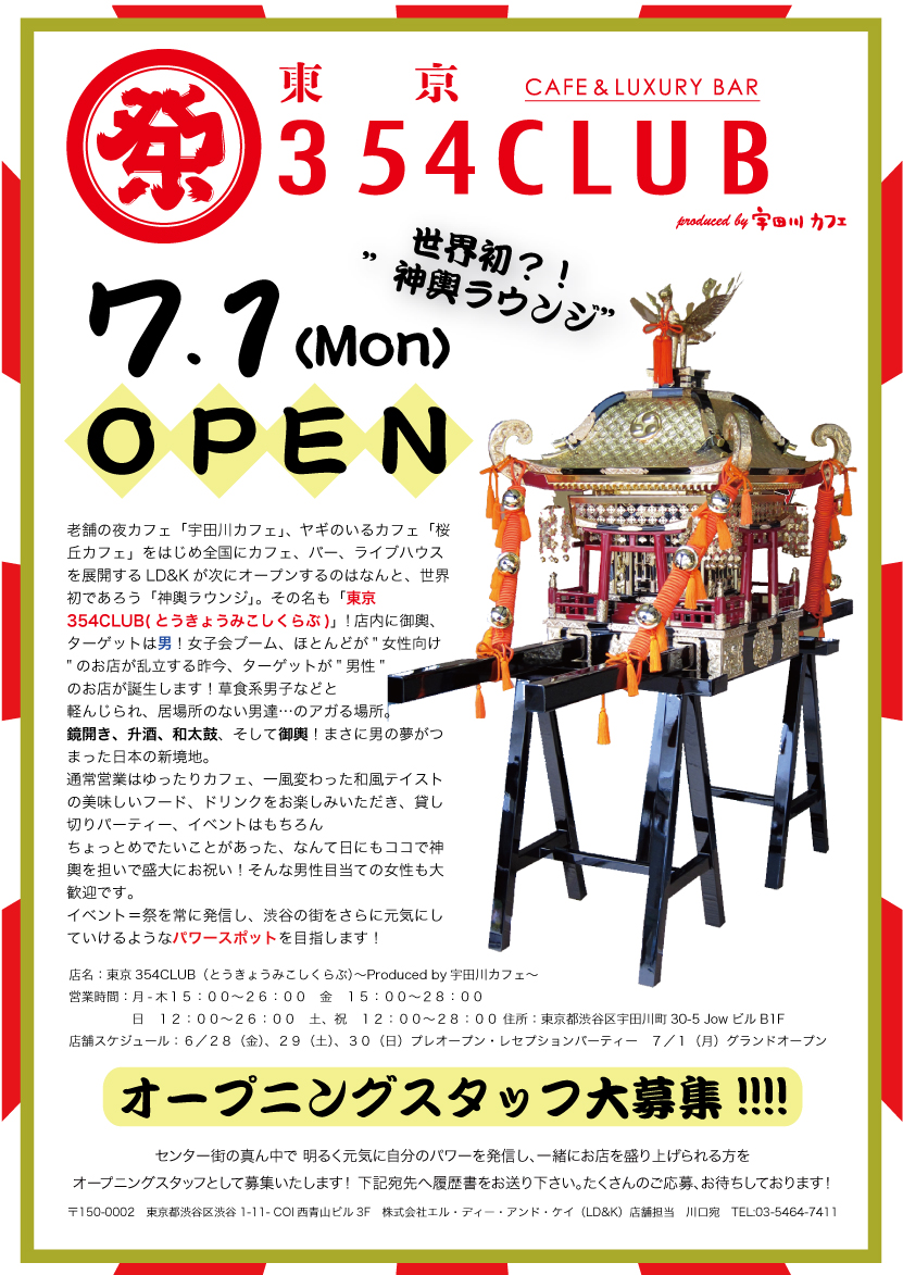 老舗の夜カフェ「宇田川カフェ」や、ヤギのいるカフェ「桜丘カフェ」をはじめ、全国にカフェ、バー、ライブハウスを展開するLD&Kが次にオープンするのはなんと、世界初であろう「神輿ラウンジ」その名も「東京354CLUB(とうきょうみこしくらぶ)」!