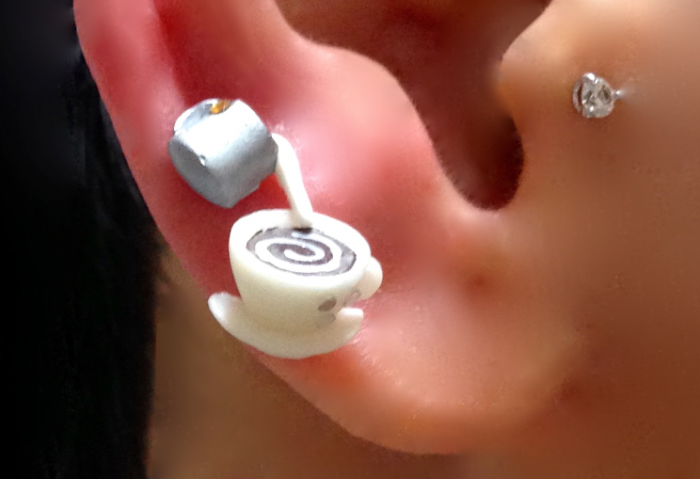 今回のプレゼント企画第二弾は、コーヒーカップとミルクピッチャーのピアスを別注オーダー!上下につければミルクを注いでいる形になるようになっていて、キラっと光るスパンコールがアクセントになっています!