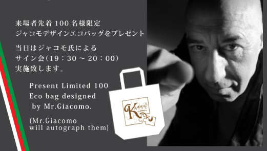 会場ではOrobianco社のワインを始め、Italian Style Party のお食事も提供され、ジャコモ氏によるサイン会や、先着100名にジャコモデザインのエコバッグをプレゼントと盛り沢山。Orobiancoファンは絶対に見逃せない内容です!