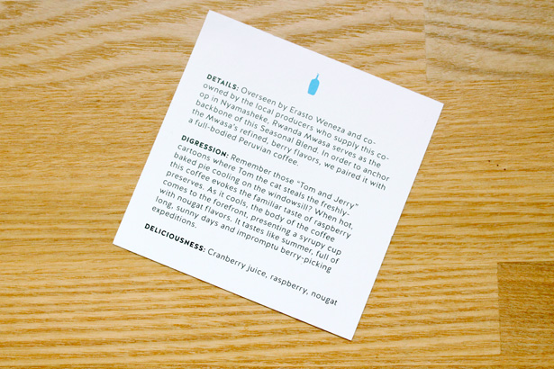 In order to anchor the Mwasa’s refined, berry flavors, we paird it with a full-bodied Peruvian coffee.