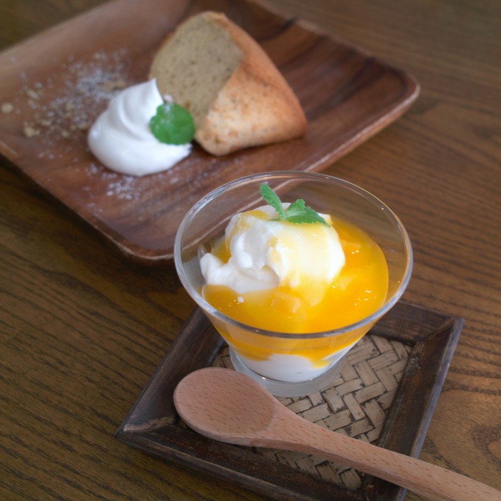 ↑手前:濃厚杏仁豆腐をマンゴーソースで。