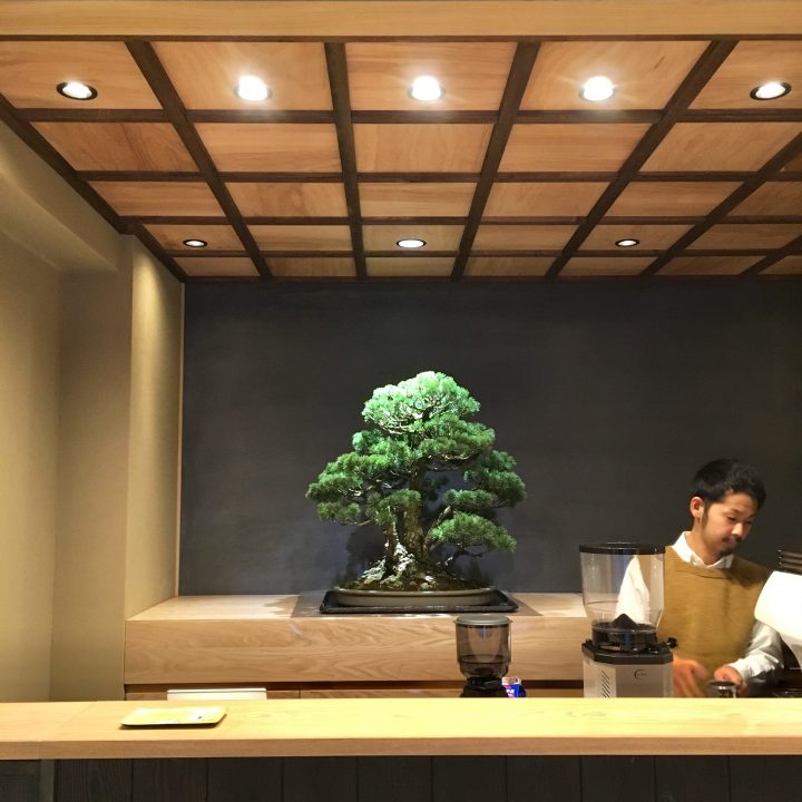 店内奥のど真ん中に鎮座する樹齢100年の美しい盆栽を眺めながら、抹茶ラテエスプレッソからパナマゲイシャなどの高級品まで、高品質な完全オリジナルのコーヒーが楽しめる。