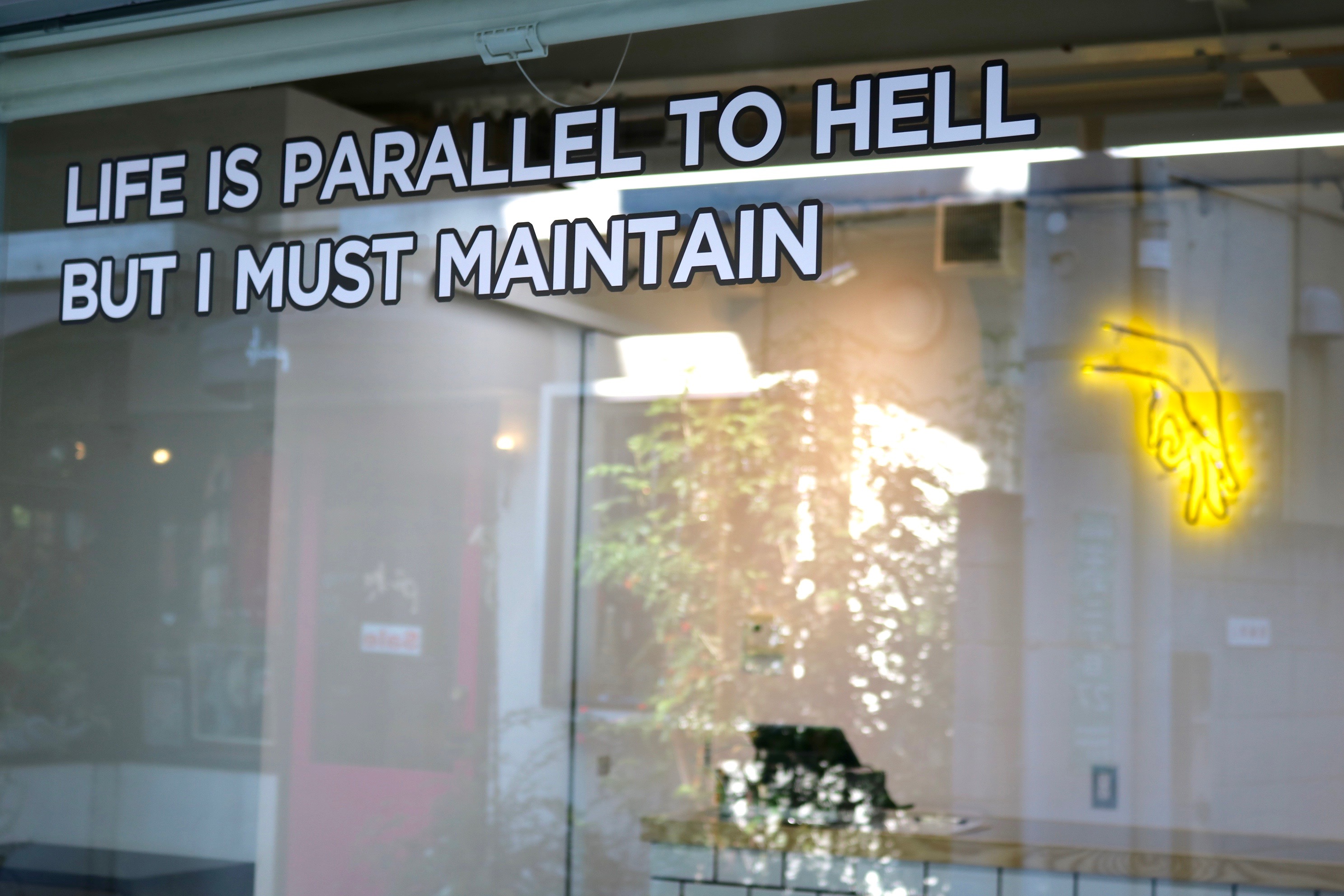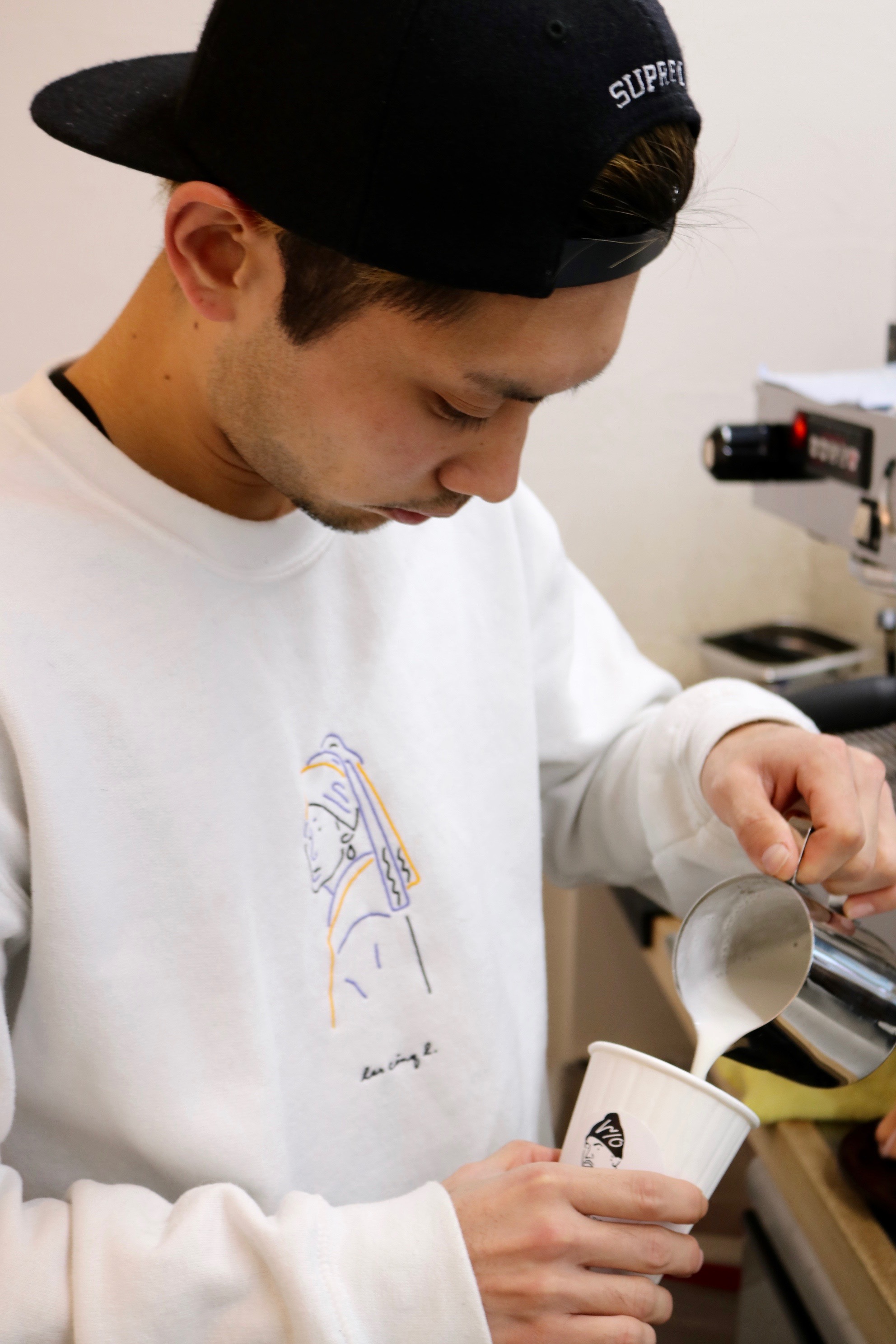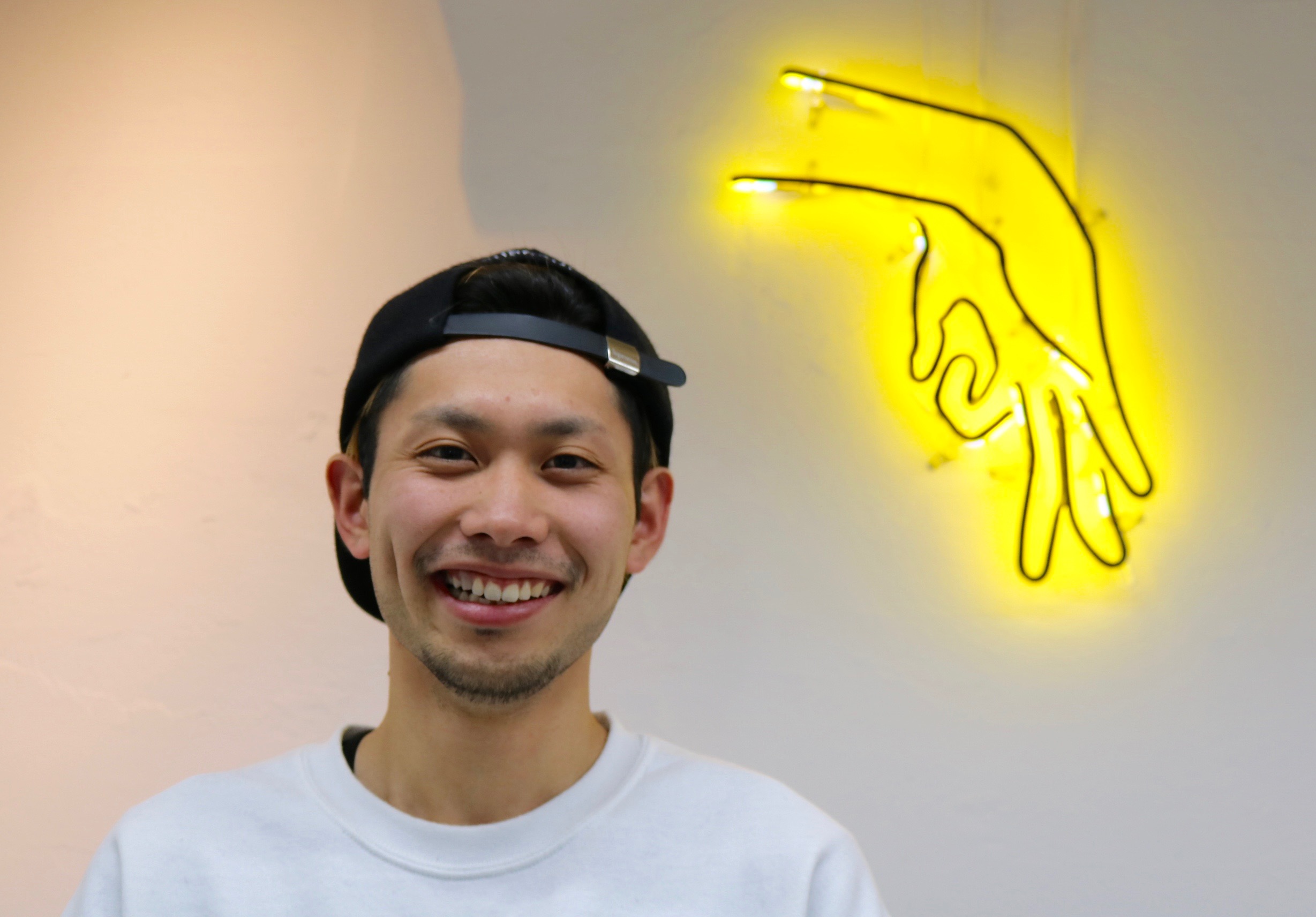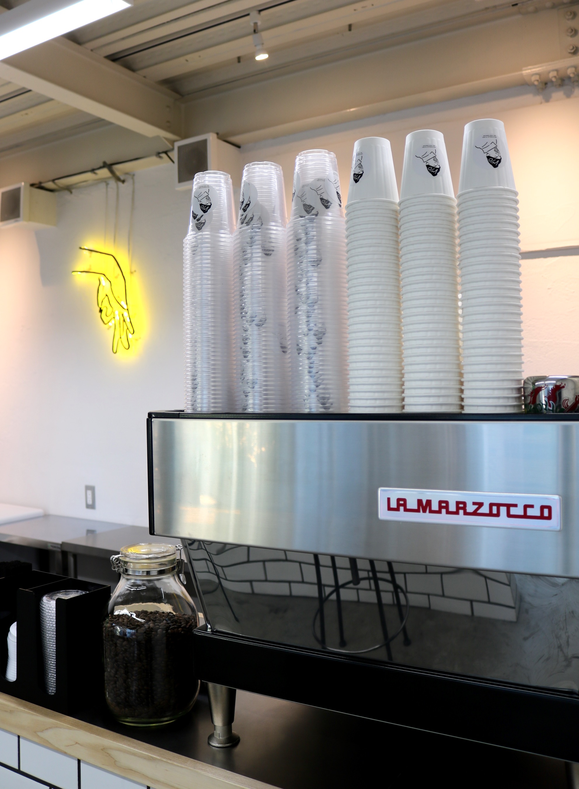 アパレル出身オーナーのディレクションの元、各店舗異なるコンセプトで店舗ごとにそれぞれキャラクターが設定されており、コーヒーカップやステッカーを全種類集める為にわざわざ遠方から来店するファンもいるほど。キャラクターにはそれぞれ元ネタがあり、よく質問されるというこちら下北沢店の印象的なネオン菅の”手のサイン”は、実は逆から見ると答えがわかるようになっていたりと遊び心が垣間見える。わかる人にはわかるというこのサンプリングの”元ネタ探し”感覚が面白い。