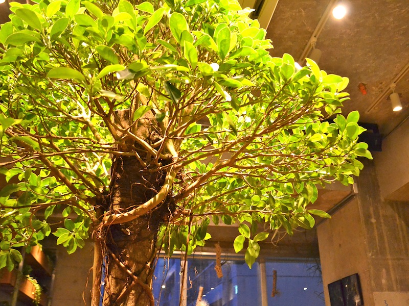 中央円卓にあるガジュマルの木をはじめ、店内には様々な植物が飾られ、